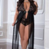 Flyaway sheer mesh gets sassy over a sexy lacy deep plunging bodysuit with an open zipper crotch.
