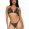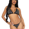 Be a stunner this summer in the 2 PC Domino Bikini Set by Leg Avenue, featuring the ultra-sexy diamond pattern rhinestone string bikini top, adjustable tie back straps, and cheeky ruched bikini bottoms. This cute bikini set is ready for lounging poolside or weekend beach bikini fun, and the triangle bikini top doubles as a cute summer fashion accessory.