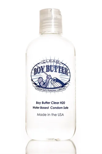 Boy Butter Clear H2O made with patented invisagel is a water-based/Vitamin E hybrid lubricant that is condom safe, vaginally safe, highly concentrated and totally water-soluble. The Vitamin E has the properties of silicone but is organic and washable, but it slows the water from evaporating in use. It is hypoallergenic, glycerin-free, pigment-free, does not stain fabrics, and washes off totally with water alone. Fortified with Aloe Vera and Vitamin E, it is gentle on your skin.