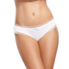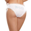 Microfiber cheeky panty with rhinestone “Bride” detail and organza ruffle trim.