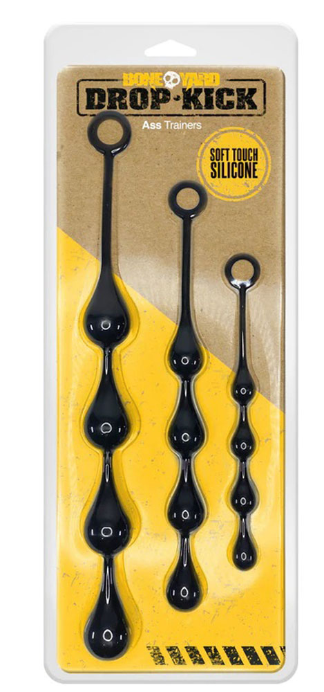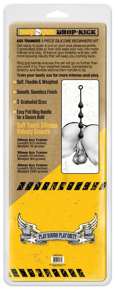 The Boneyard Drop-Kick Silicone 3-Piece ass trainer is the perfect beginners kit for anal kinksters. Get ready to push and pull on your anal pleasure points. The kit comes with 3 graduated sizes to train and ease your way into more intense anal play. Enhance your foreplay and sex with mind blowing results that will keep you cumming back for more. The ring grip handle ensures the set will go no further than you want it to. Four weighted beads connected by stretchy and flexible silicone from handle to tip. Absolutely no filler. Train your beefy ass for more intense anal play.