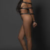 Full torso restraint harness with adjustable buckle back straps and adjustable t-back with metal rings and studs, separate adjustable wrist restraint.