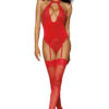 This sexy lingerie comes with a stretch lace and stretch velvet garter teddy, has a halter neckline with hook and eye back closure. Velvet waist corset detail with adjustable back elastic straps, open crotch and attached/adjustable front garters, shown with style 0001 thigh high (sold separately)