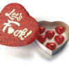 Your Valentine will swoon when you surprise them with this X-Rated “I Fuck’n Love You” or “Let’s Fuck” heart-shaped box of creamy milk chocolates. Each box contains six finely crafted chocolates sourced from one of Canada’s premier chocolatiers and are individually wrapped in a shiny red foil. Tell your lover how you really feel with this naughty box of candy.
