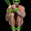 Add a kinky glow to your bedroom bondage fun! This Glowing Bondage Kit makes it easy to tie up your sub and enjoy the world of bondage in the dark. The included cuffs, paddle, and blindfold are an attractive white and gold in the light, but transform into glowing tools of kink so you can play in dimly lit scenes with ease.