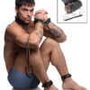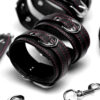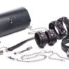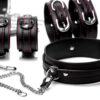 Each cuff and collar are adjustable, featuring large D-Rings so you can tie them down with additional accessories. The soft cuffs and collar are easy on the flesh, and the included chain leash makes it easy to lead your sub around while you play.