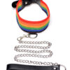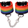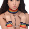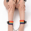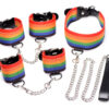 Display your proud submissive side with this rainbow patterned bondage kit! Everything you need to engage in light bdsm is included in this colorful set – rainbow pattern wrist and ankle cuffs with chains, and a wide collar with chain leash. The nylon material is low maintanence, sturdy, and easy on the flesh during use! Perfect for all skill levels of bondage play who desire a portable set of restraints for kinky and flashy fun on the go.