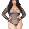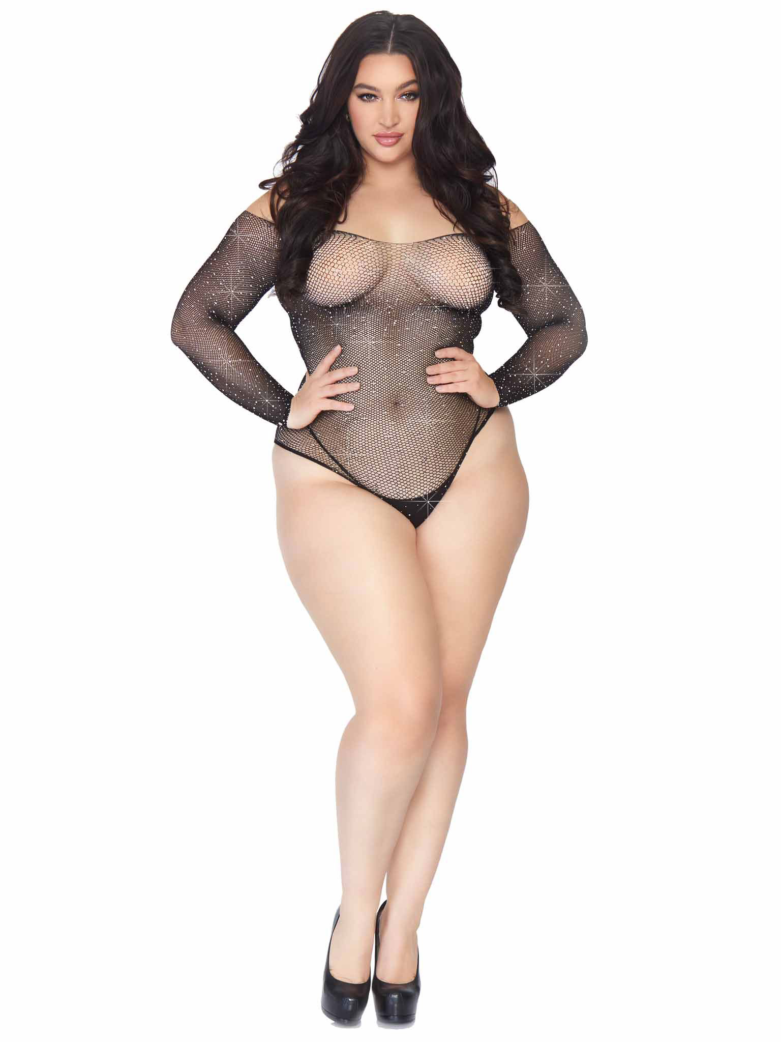 All eyes will be on you in this Rhinestone fishnet Bodysuit by Leg Avenue. A versatile and sexy plus size lingerie piece, this one-piece must have features all over rhinestone detail on the long sleeved, Snap Crotch lingerie Bodysuit. Perfect for layering as part of a festival outfit, under a blazer, or surprise your boo with a sexy night in.