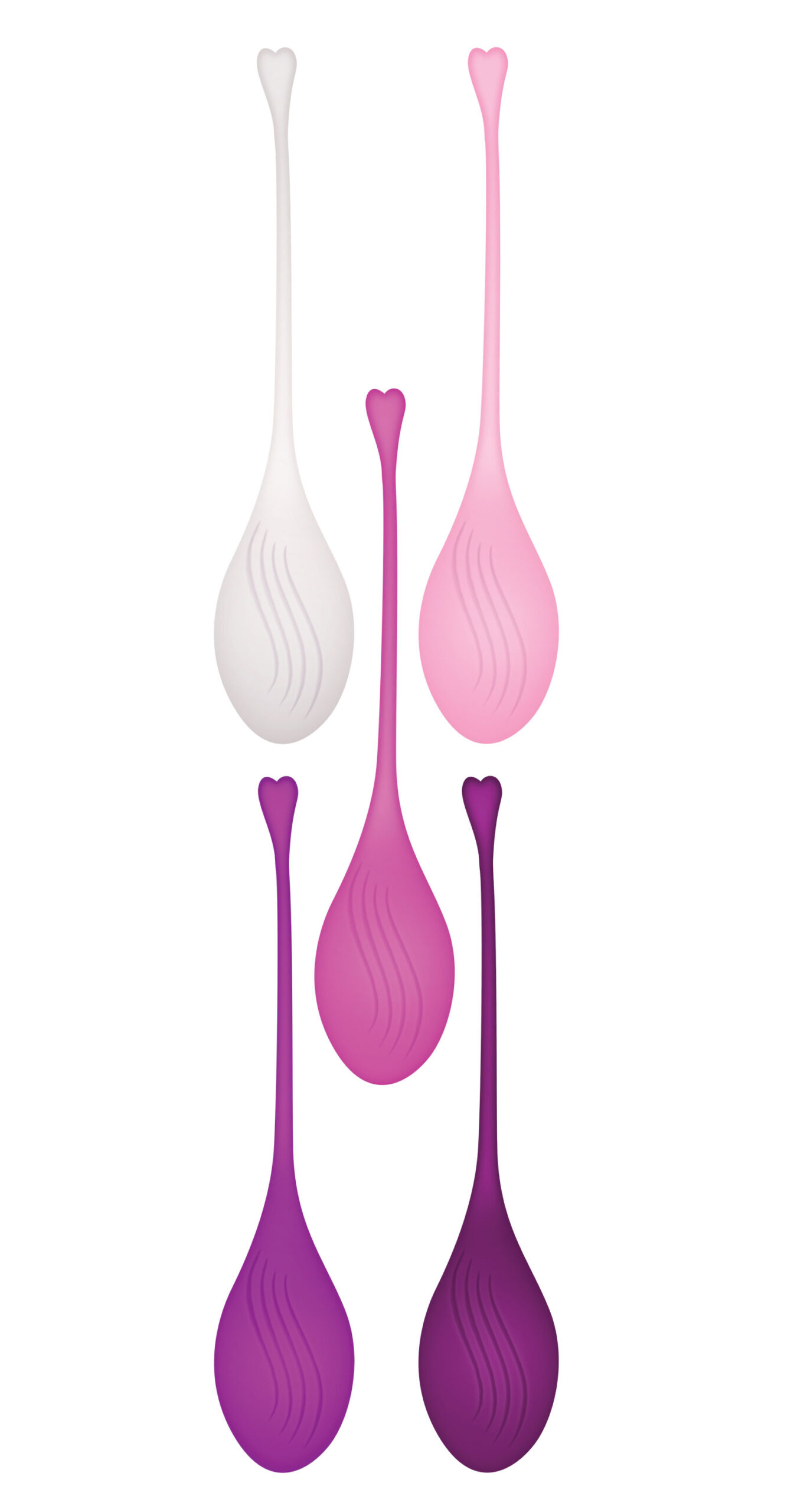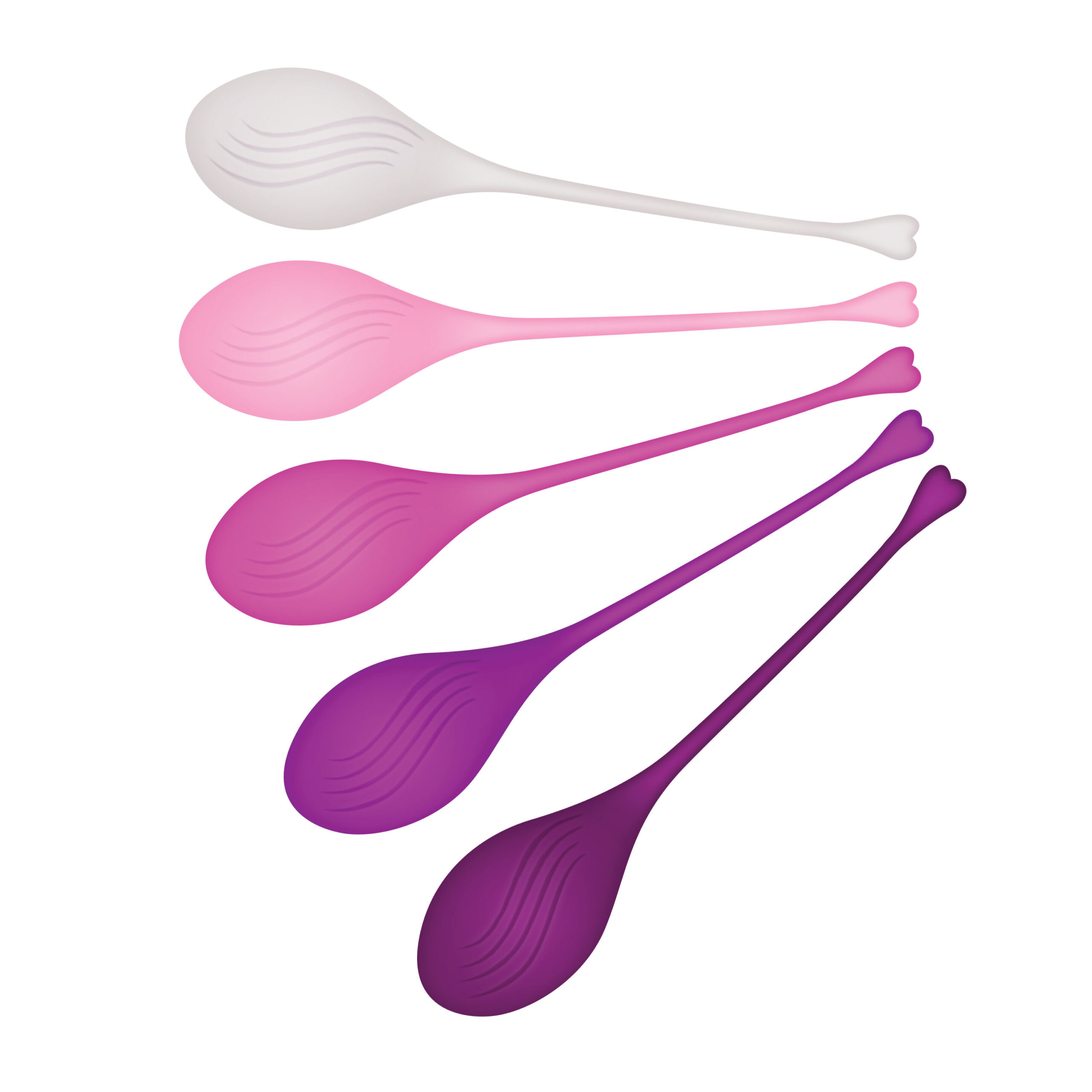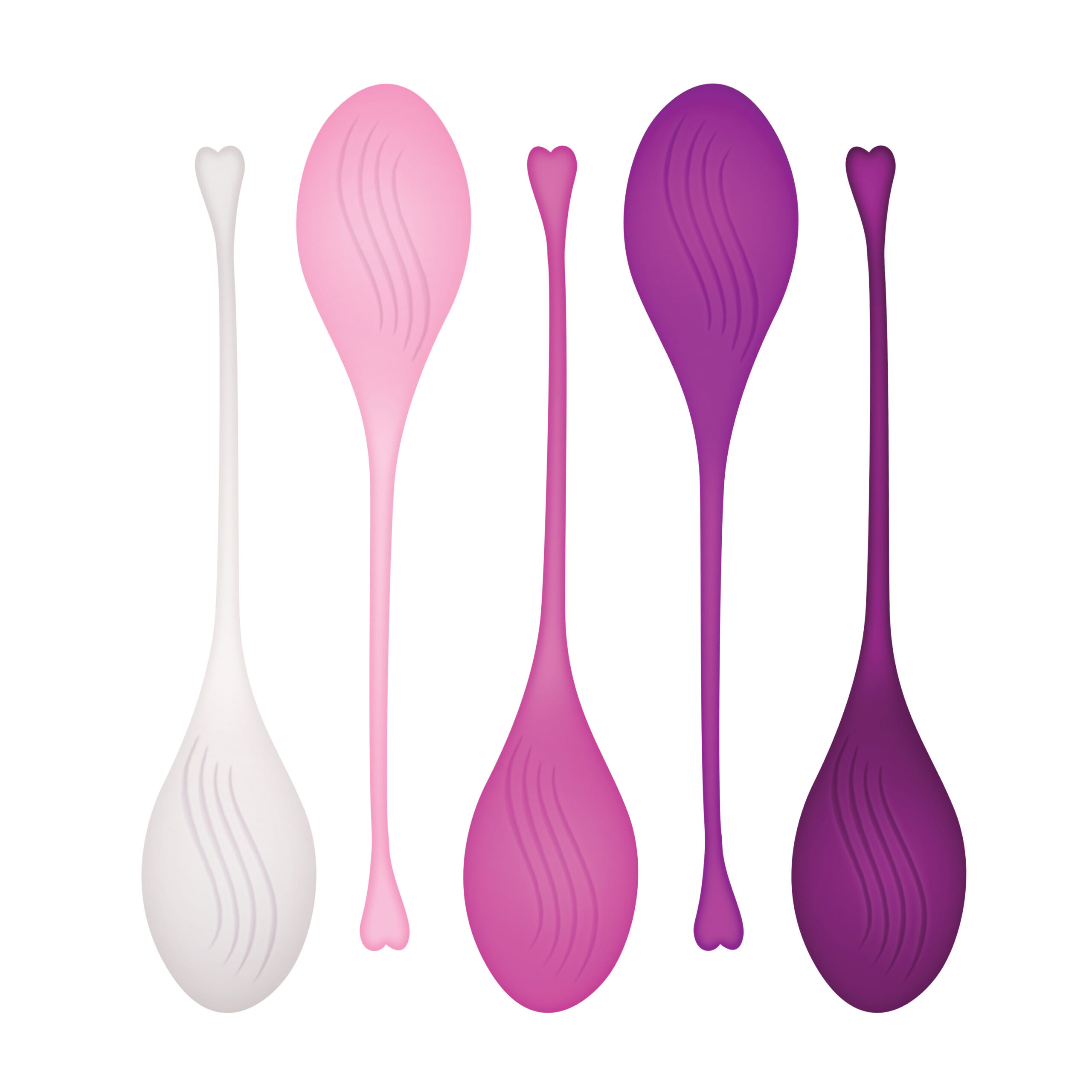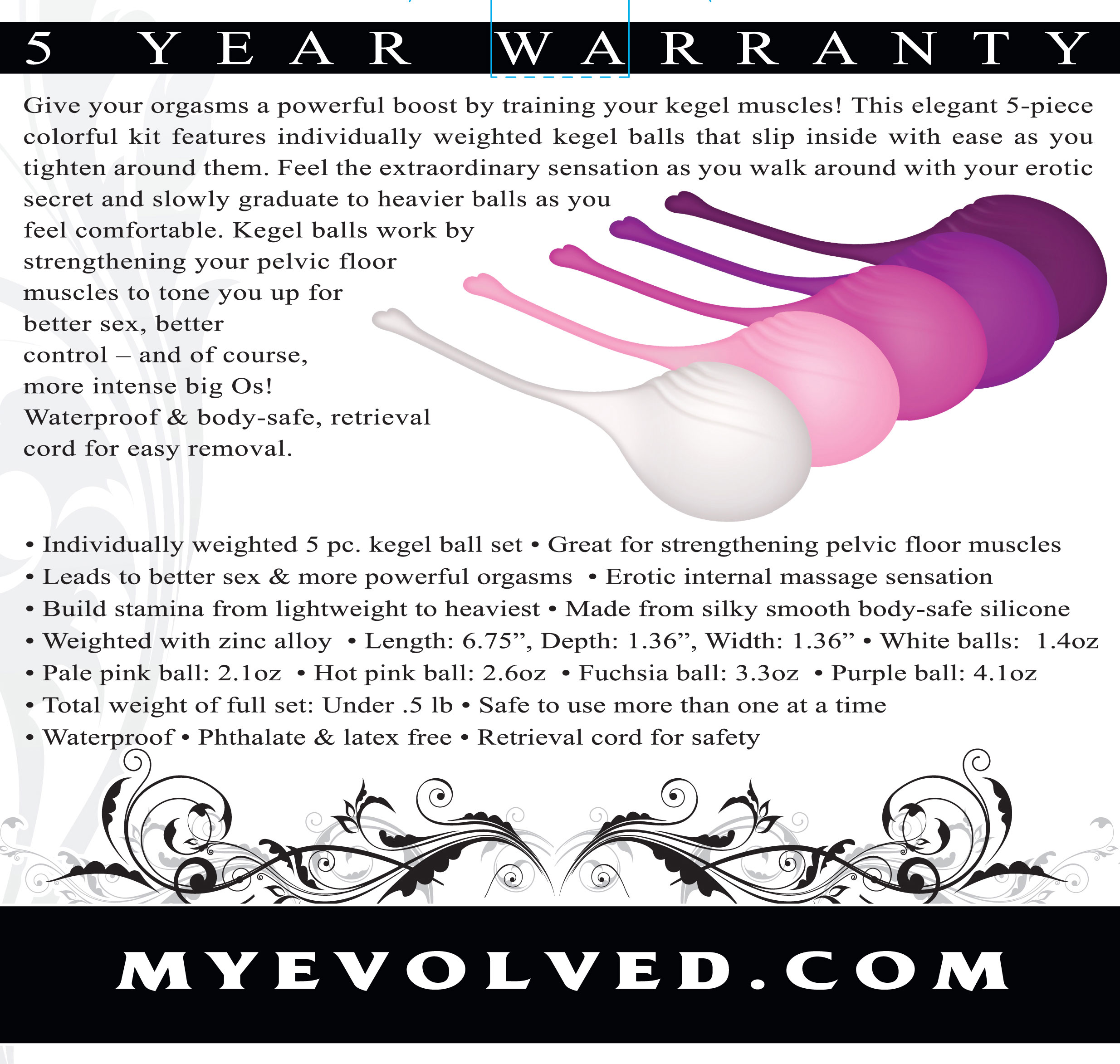 Give your orgasms a powerful boost by training your kegel muscles! This elegant 5-piece colorful kit features individually weighted kegel balls that slip inside with ease as you tighten around them. Feel the extraordinary sensation as you walk around with your erotic secret and slowly graduate to heavier balls as you feel comfortable. Kegel balls work by strengthening your pelvic floor muscles to tone you up for better sex, better control and of course, more intense big Os! Waterproof and body-safe, retrieval cord for easy removal.